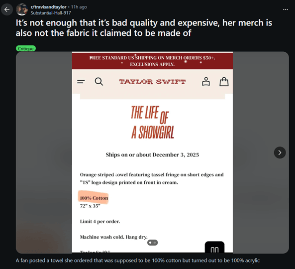 The latest controversy erupted when a fan ordered a “The Life of a Showgirl” towel advertised as 100% cotton, only to discover it was actually acrylic, a fabric nobody on earth would willingly choose for a towel. Fans immediately pointed out how huge the difference is: cotton absorbs; acrylic repels. It’s the kind of material swap you’d expect from a sketchy Amazon seller, not from the biggest pop star on the planet selling a $45 towel.
